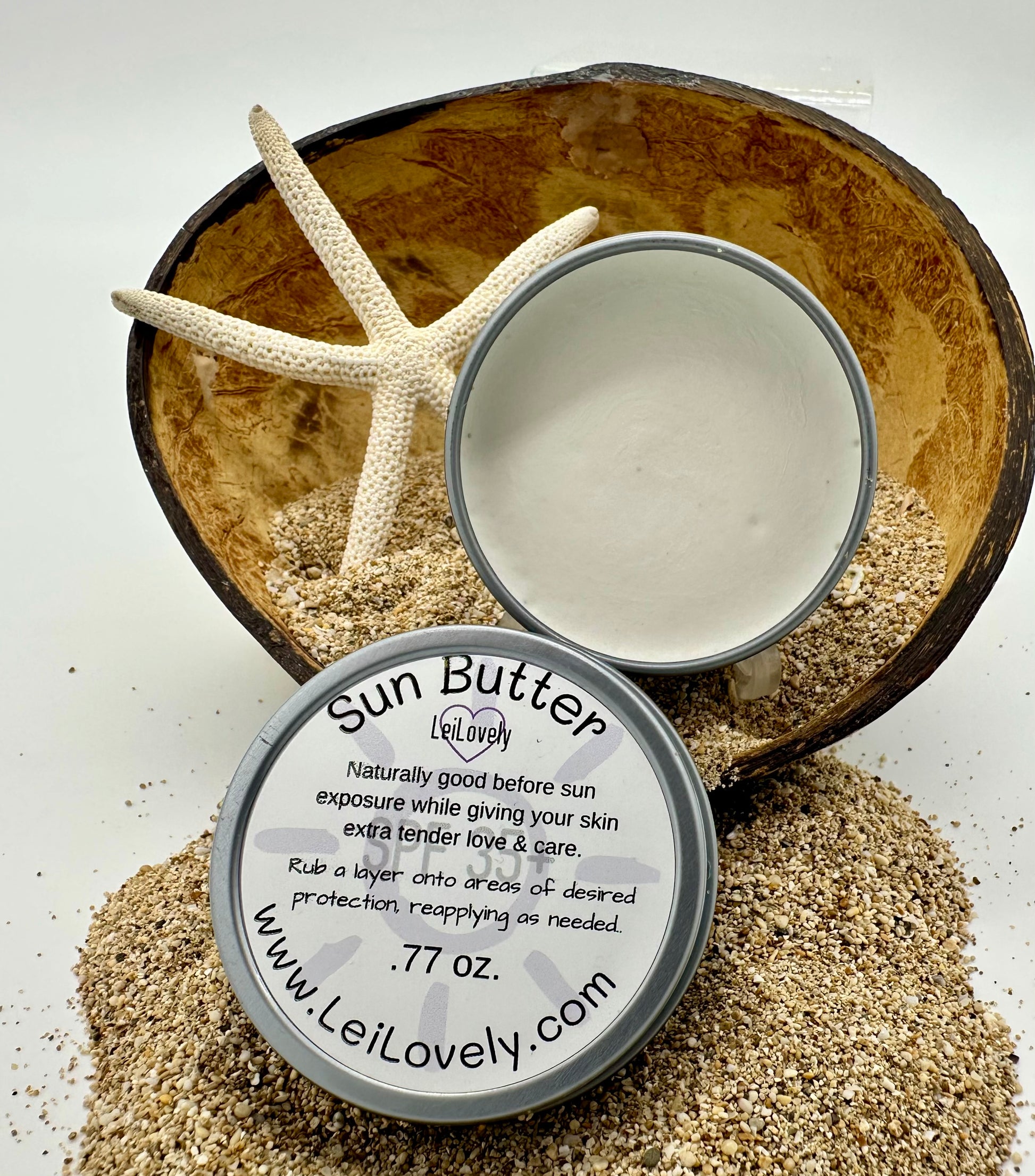 Are you someone who loves having fun outdoors but is concerned about the use of harsh chemicals in regular sun screens? Look no further than LeiLovely's Sun Butter. Originally created for beach lovers, surfers, and those who live on the water, this balm is perfect for anyone looking to protect their skin from the sun without the use of those pesky chemicals. It nourishes skin too, with premium natural butters. Plus, it’s completely safe for water, reefs, fish wildlife and people. We’ve packaged it in a reusable tin so you can toss one in the camper, your purse, tent, trailer, boat, diaper bag, anywhere you want to be ready for the sun!